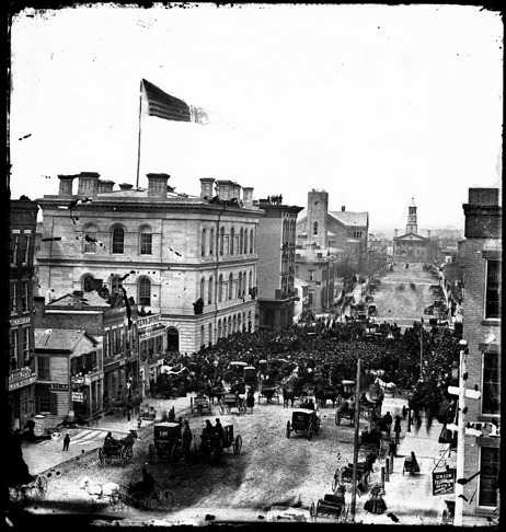 Large crowd gathers at the Federal Post Office building at the corner of Larned and Griswold on April 20, 1861 to hear speeches and declare an oath of allegiance after President Lincoln calls for troops to defend the Union. Horse-drawn carriages on street in foreground. Recorded in glass negative ledger: "D/History-Civil War."