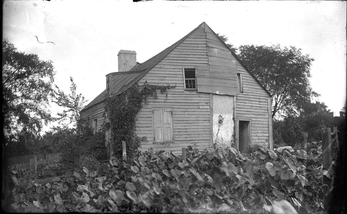 View of the back of the Hamtramck residence in Detroit, Michigan, with garden in foreground. Windows partially boarded up. Also have print from negative. Stamped on cabinet card back: "Earle, photographer, 258 Woodward Ave., Detroit, Mich." Typed on label on albumen cabinet card back: "Old Hamtramck house in 1891." Handwritten on albumen cabinet card back: "Hamtramck house, 1891. This house was built in 1802 on property purchased by Colonel Hamtramck. Hamtramck, who came from Quebec, is famous for his service to the American cause during the revolution. He was with Gen. Anthony Wayne at the Battle of Fallen Timbers and was chosen to be the first American commandant of Detroit. He held this post from the time of the British evacuation on July 11, 1796 until the arrival of General Wayne two months later. Hamtramck again became commandant on the year he erected the house pictured. He died the following year leaving his property to his widow. In 1892, the house, though still standing, was in a dilapidated condition and was soon demolished. It was located on the river bank between what are now Van Dyke and Baldwin Avenues." Recorded in glass negative ledger: "D/Historic houses-Hamtramck."