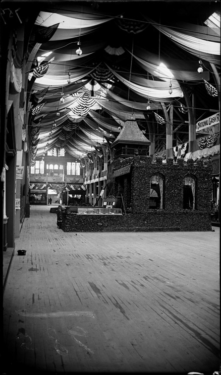 Berry Brothers exhibit at the Detroit International Fair & Exposition, which appears to be a castle shaped booth made of stones, with a glass exhibit case on one side, this exhibit sits inside a larger exhibition building. Recorded in glass negative ledger: "D/Exhibitions-Detroit international fair & exposition."