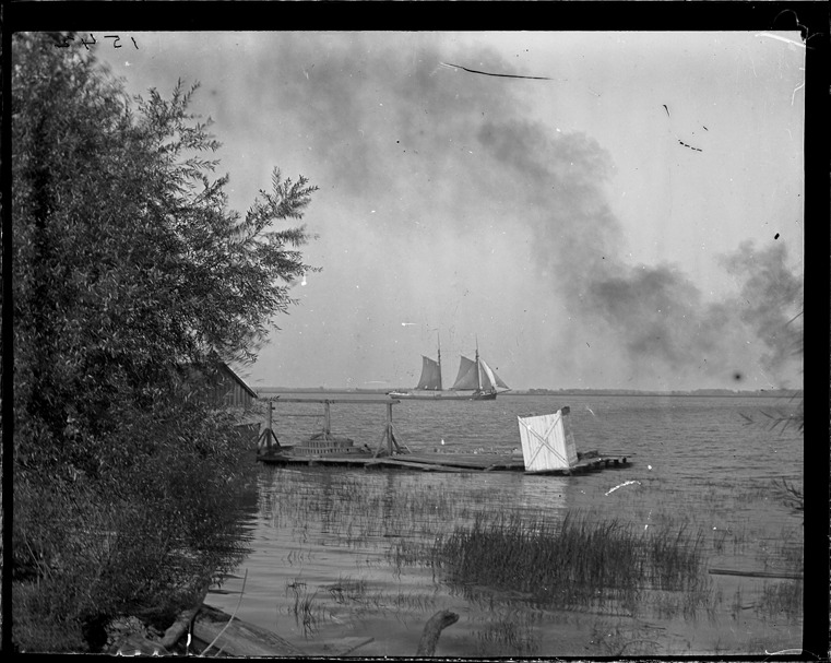 View of a schooner on the Detroit River off Grosse Ile, with dock and boathouse in foreground and smoke rising in the distant background. Recorded in glass negative ledger: "D/River-Islands-Grosse Ile."