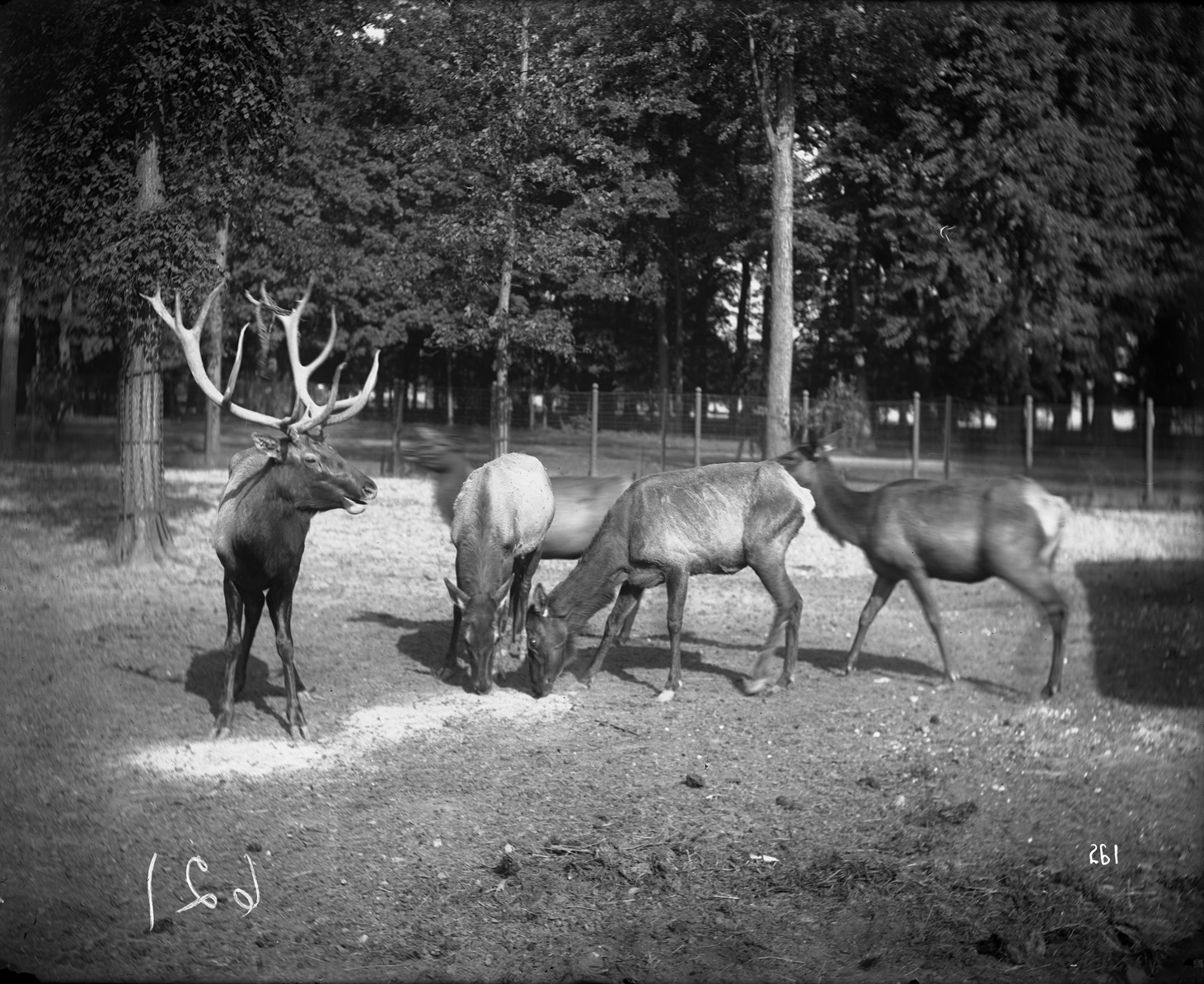 Four deer, one a male with large antlers, graze at Belle Isle Zoo, with fence and trees in background. Recorded in glass negative ledger: "D/Parks-Belle Isle-Zoo."