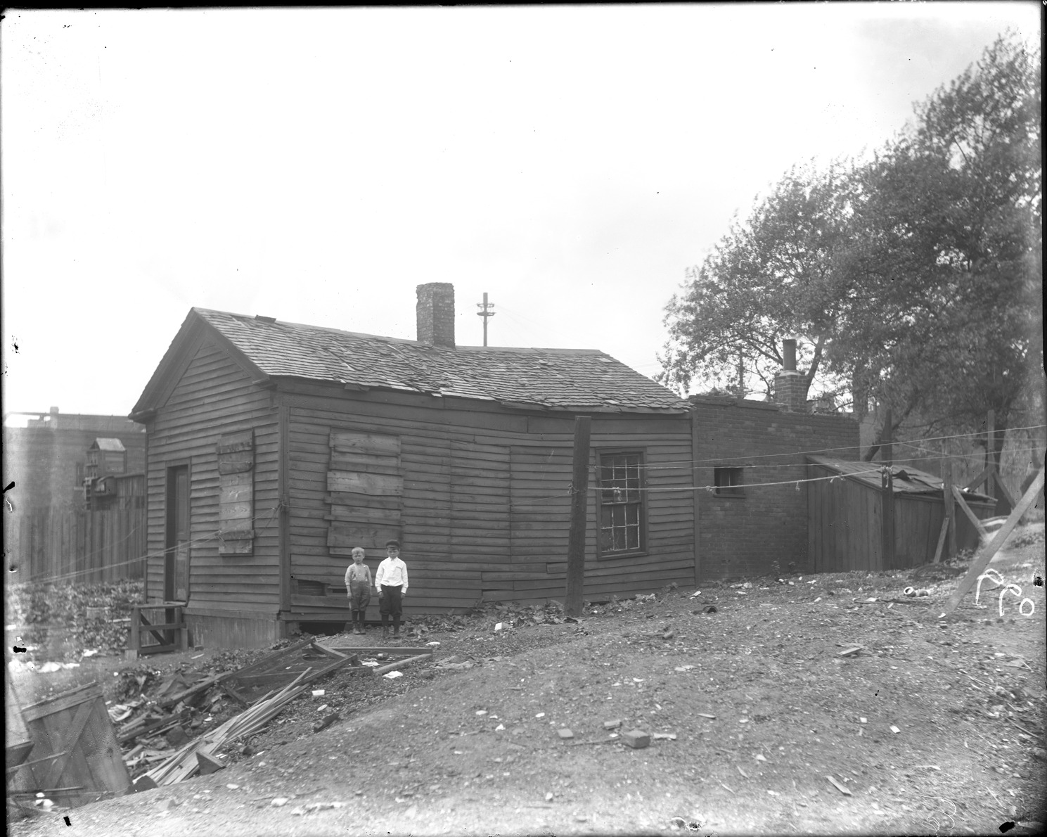 Favorite this☆ Wooden-frame house on Franklin Street Description: Two boys stand in front of a decaying single story wooden-frame house on Franklin Street, with rubble in foreground. Recorded in glass negative ledger: "D/Streets-Franklin, house in rear #165, Franklin N.E., no number on house." Details Resource ID: EB02d326 Subject: Wooden-frame houses--Michigan--Detroit Boys--Michigan--Detroit Glass negatives Date Issued: Unknown year Format: 1 negative : glass ; 8 x 10 in. Member of: Burton Historical Collection Negative Number: BHC glass neg. no. 660 Rights: Physical rights are retained by DPL. Copyright is retained in accordance with U.S. copyright laws.
