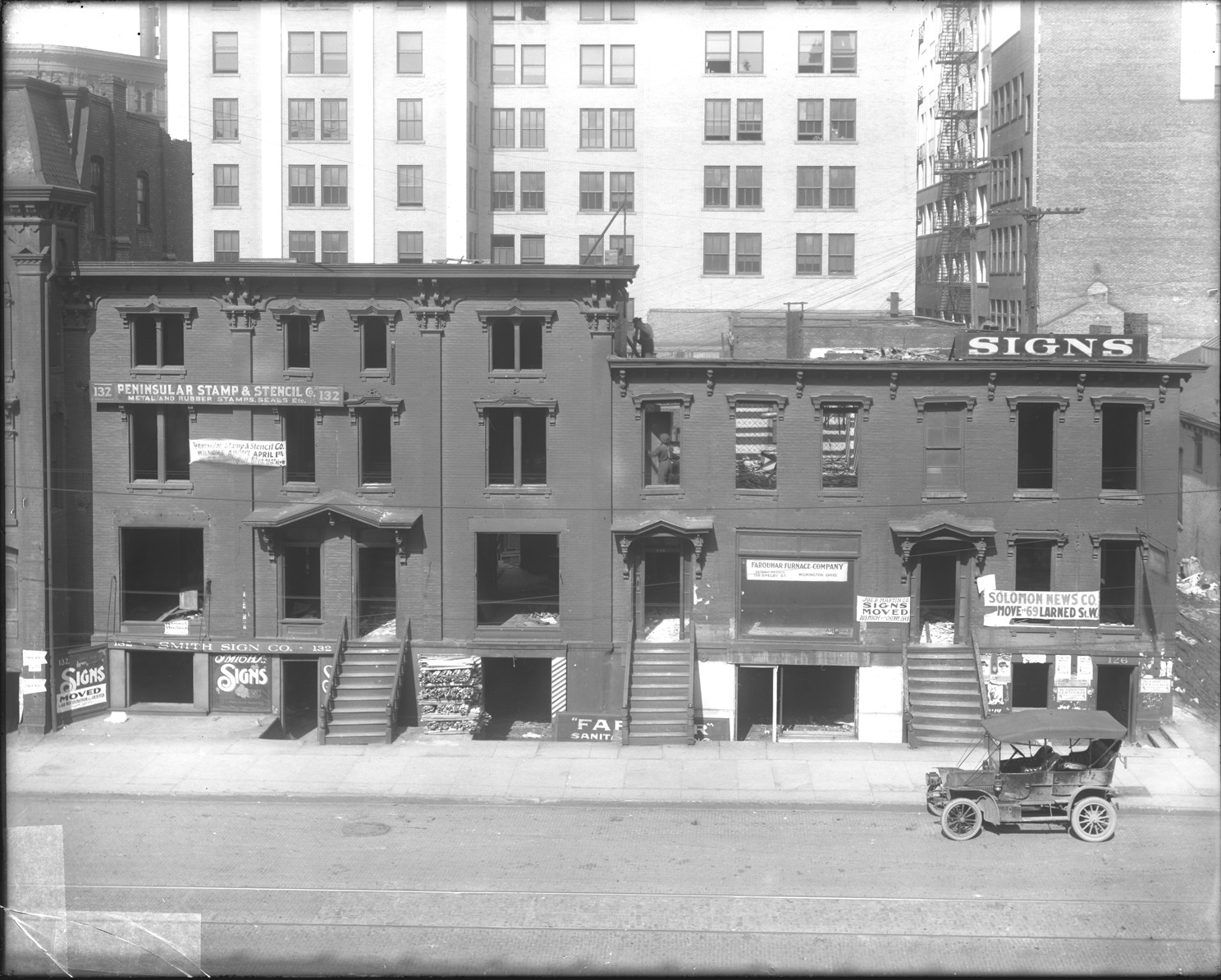 View of the Penninsular Stamp & Stencil Co. and other businesses on Shelby Street, it appears as though the building may be coming down as most companies have moving signs in windows and building looks empty. Recorded in glass negative ledger: "D/Streets-Shelby, south of Lafayette Blvd., April 29, 1913."