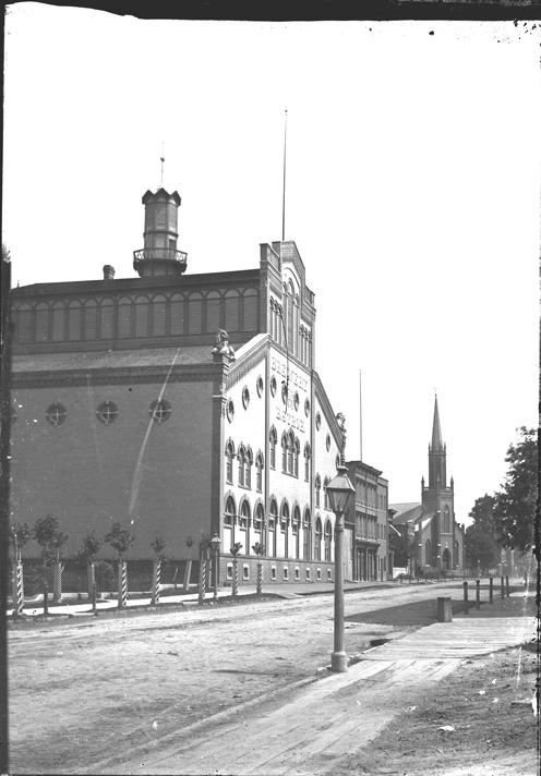 View of Stroh Brewery at the corner of Gratiot and Rivard taken from across the street, with Trinity Lutheran Church in the background.