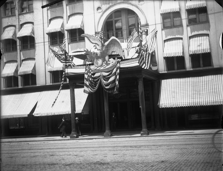 Favorite this☆ Hotel Cadillac entrance on Michigan Avenue Description: View of the entrance to the Hotel Cadillac, decorated with an American eagle and American flags. Recorded in glass negative ledger: "D/Hotels-Cadillac." Details Resource ID: EB02d397 Subject: Hotels--Michigan--Detroit Streets--Michigan--Detroit Flags--United States Glass negatives Date Issued: Unknown year Format: 1 negative : glass ; 4 x 5 in. Member of: Burton Historical Collection Negative Number: BHC glass neg. no. 738 Rights: Physical rights are retained by DPL. Copyright is retained in accordance with U.S. copyright laws.