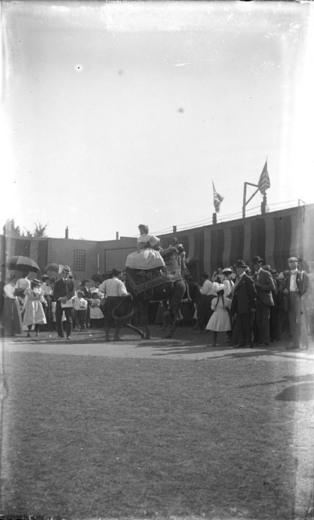 Young woman rides a camel while crowd watches at the Elks carnival on June 13, 1893. Recorded in glass negative ledger: "D/Organizations-Elks, Benevolent & protective order of, carnival, June 13th, 1893."