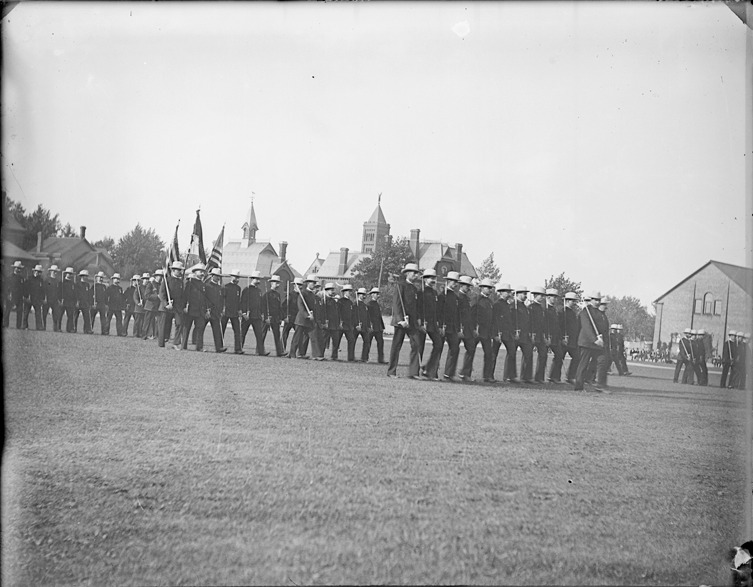 Group of Knights Templar in uniform, carrying swords, march in formation on field. Recorded in glass negative ledger: "LD/Organizations-Freemasons-Knights Templar."