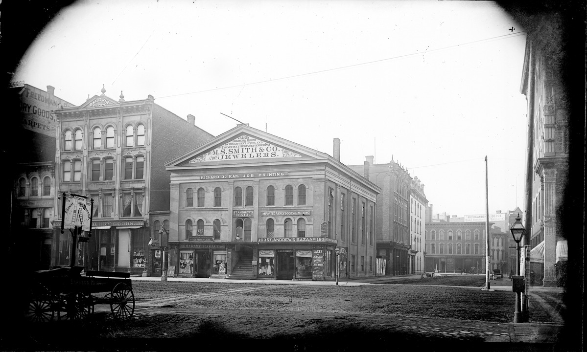 Favorite this☆ St. Andrew's Hall on Woodward Avenue Description: View of St. Andrew's Hall and other businesses on Woodward Avenue, with a view of the street. Recorded in glass negative ledger: "D/Streets-Woodward Ave. & State." Details Resource ID: EB02d493 Subject: Halls--Michigan--Detroit Streets--Michigan--Detroit Commercial buildings--Michigan--Detroit Glass negatives Date Issued: Unknown year Format: 1 negative : glass ; 4.75 x 8 in. Member of: Burton Historical Collection Negative Number: BHC glass neg. no. 857 Rights: Physical rights are retained by DPL. Copyright is retained in accordance with U.S. copyright laws.