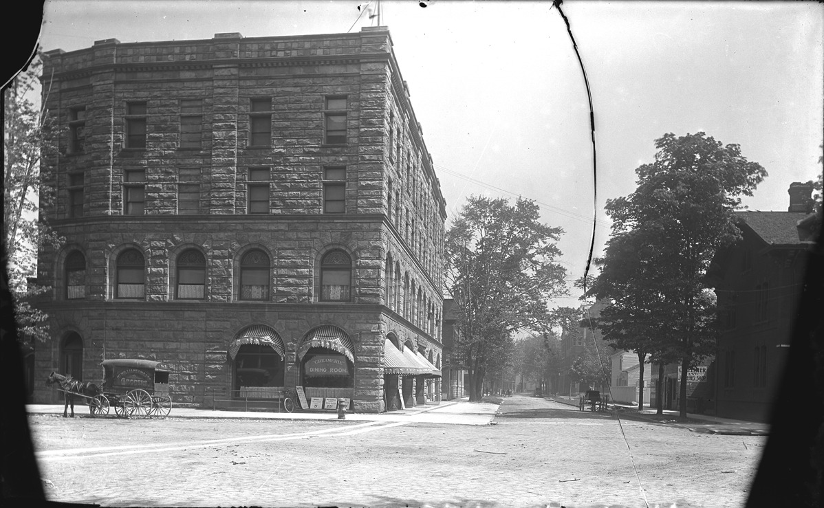Horse-drawn truck sits in front of the Catholic Club building, with view down side street. Four-story stone building, with awnings over arched ground-floor windows. Signs include: McWilliams & Moore, grocers (on truck); Creamerie Dining Room. Also have print from negative. Handwritten on albumen print mat front: "Catholic Club house - NE on Wilcox St." Handwritten on mat back: "Catholic Club, cor. Farmer and Gd. River. 29-31 Wilcox (23-29), NE cor. Barclay Place. Wilcox now Grand River Ave. East; Barclay Place now Farmer St. 885." Recorded in glass negative ledger: "LD/Organizations-Catholic Club."