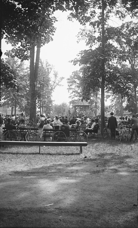 People sit on benches facing a gazebo at Belle Isle, with bicycles behind many benches. Recorded in glass negative ledger: "LD/Parks-Belle Isle, Aug. 1898."