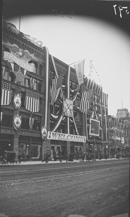 View of Metcalf Bros. & Co. and R.H. Traver with other businesses on Woodward Ave., decorated with flags and welcome signs for them G.A.R. 25th National Encampment. Recorded in glass negative ledger: "LD/Conventions-G.A.R.-25th national encampment, Detroit, 1891."