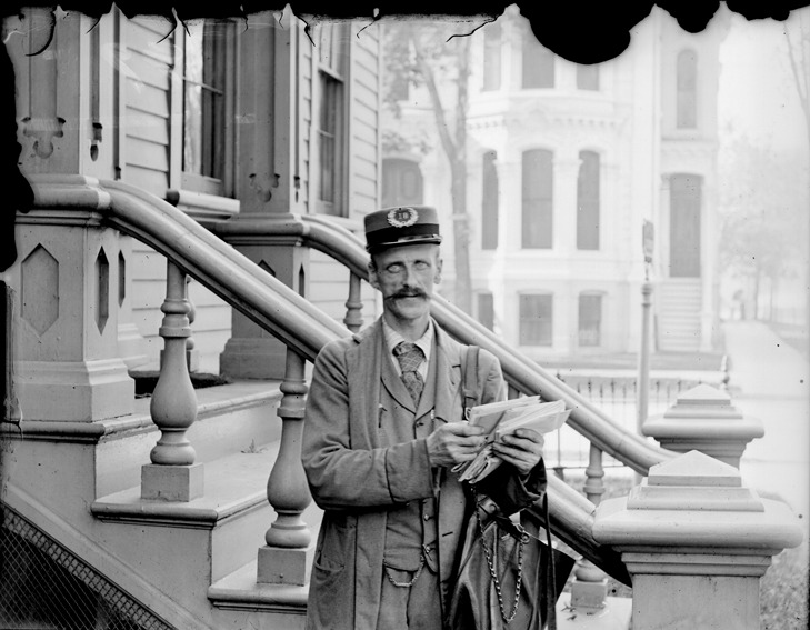 Uniformed postal worker poses with mail in front of porch. Recorded in glass negative ledger: "LD/Postal service, postman."