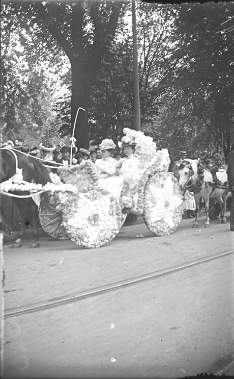Women sit in horse-drawn carriage decorated with flowers for Detroit's bicentennial celebration. Recorded in glass negative ledger: "D/Anniversaries-Bicentenary, 1901." Image is out of focus.