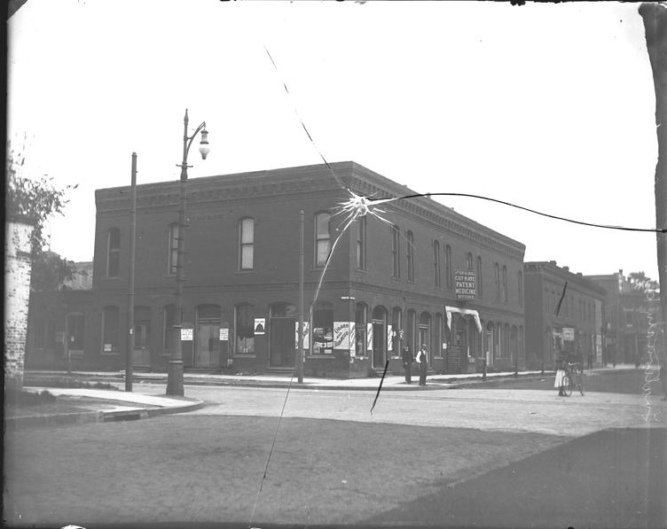 View of businesses including The Original Cut-rate Patent Medicine Store on State Street, with a view of the street. Recorded in glass negative ledger: "LD/Buildings-Day Block." Spiderweb crack on glass negative spreads out from center.