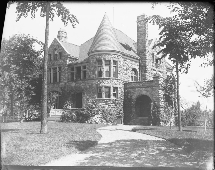 View of the Julius Stroh residence, a three story stone house in the Richardsonian Romanesque Victorian style. Recorded in glass negative ledger: "LD/Historic houses-Stroh, Julius."