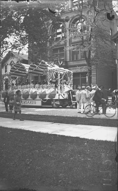Women sit on parade float for Newland's, decorated with umbrellas and flowers, participating in Detroit's bicentennial celebration. Recorded in glass negative ledger: "LD/Anniversaries-Bicentenary."