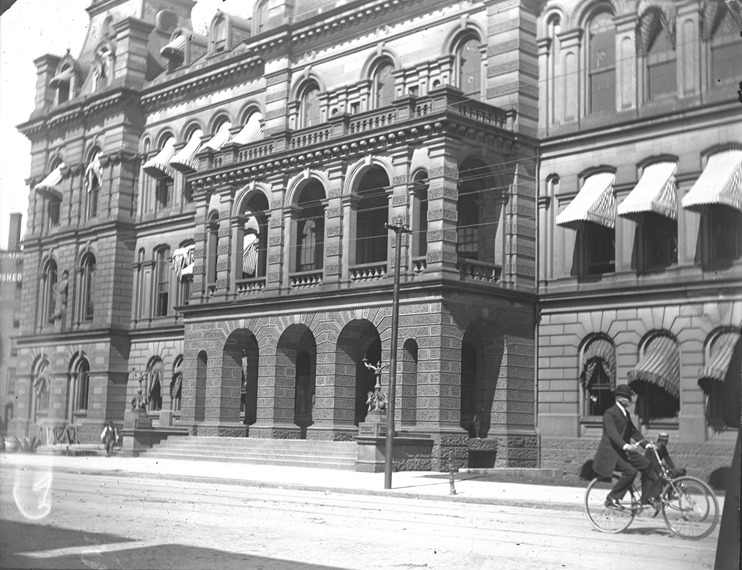 Man rides bicycle past the Detroit City Hall. Recorded in glass negative ledger: "LD/Buildings-City hall, 1871."