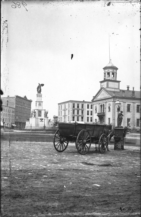 Old Detroit City Hall and the Soldiers' and Sailors' Monument with a horse-drawn vehicle in right foreground parked near drinking fountain. Recorded in glass negative ledger: "LD/Buildings-City hall, 1835-1871."