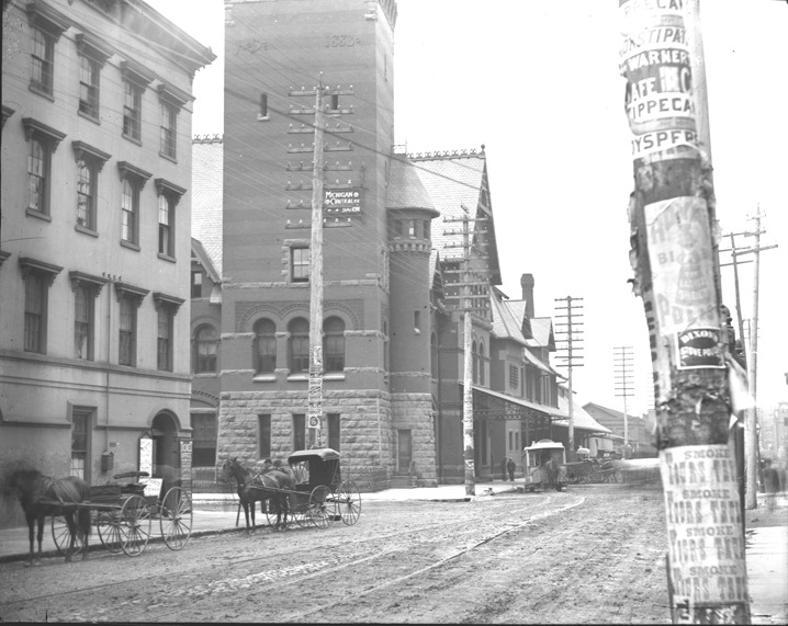 View down the street at the Michigan Central Railroad Station, with other buildings on left and horse-drawn vehicles in street. Recorded in glass negative ledger: "D/Railroads-M.C. (depot), 1883."