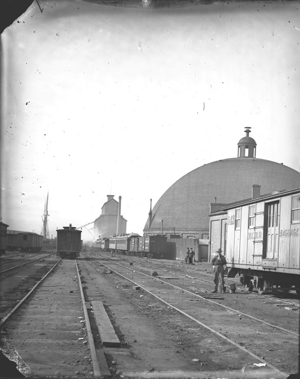 Men stand near railroad tracks and cars at the Michigan Central Railroad with roundhouse in background. Recorded in glass negative ledger: "D/Railroads-Michigan Central."
