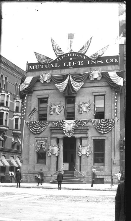 Michigan Mutual Life Insurance Co. on the corner of Jefferson Ave. and Griswold Street, decorated with patriotic bunting and a sign reading: "Welcome comrades." Recorded in glass negative ledger: "D/Industries & bus. houses-Mich. Mutual Life Insurance Co."
