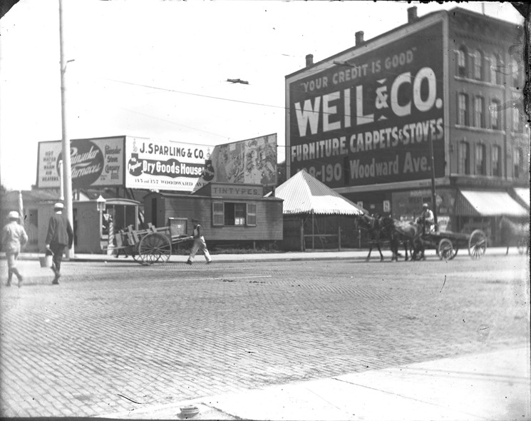 Favorite this☆ Tintype shop on Woodward Avenue Description: Tintype shop on Woodward Avenue with other businesses and view of the street. Recorded in glass negative ledger: "LD/Streets-Woodward." Details Resource ID: EB02d958 Subject: Commercial buildings--Michigan--Detroit Photographic industry--Michigan--Detroit Woodward Avenue (Mich.) Streets--Michigan--Detroit Glass negatives Date Issued: Unknown year Format: 1 negative : glass ; 4 x 5 in. Member of: Burton Historical Collection Negative Number: BHC glass neg. no. 1443 Rights: Physical rights are retained by DPL. Copyright is retained in accordance with U.S. copyright laws.