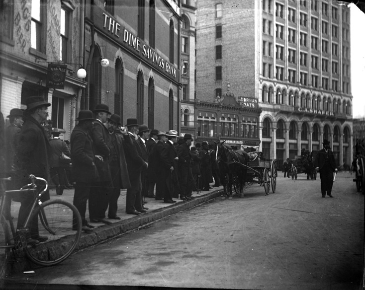 Favorite this☆ Michigan and Lafayette Description: Men standing on street of Michigan and Lafayette in front of The Dime Savings Bank along with other buildings, and a horse & buggy. Recorded in glass negative ledger: "LD/Streets-Michigan & Lafayette." Details Resource ID: EB02d962 Subject: Bank buildings--Michigan--Detroit Horse-drawn vehicles--Michigan--Detroit Glass negatives Date Issued: Unknown year Format: 1 negative : glass ; 5 x 4 in. Member of: Burton Historical Collection Negative Number: BHC glass neg. no. 1447 Rights: Physical rights are retained by DPL. Copyright is retained in accordance with U.S. copyright laws.