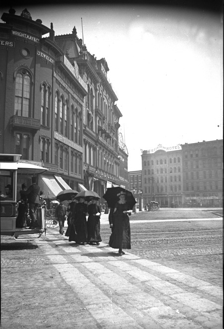 People boarding a streetcar, four women with parasols crossing in front. Wright, Kay & Co. jewelers and Gies's European Hotel in background. Recorded in glass negative ledger: "D/Streets-Woodward & Campus Martius."