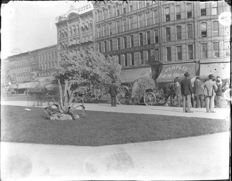 Gies's European Hotel and other businesses on Monroe Street, with horse-drawn vehicles and trees. Recorded in glass negative ledger: "D/Trees."