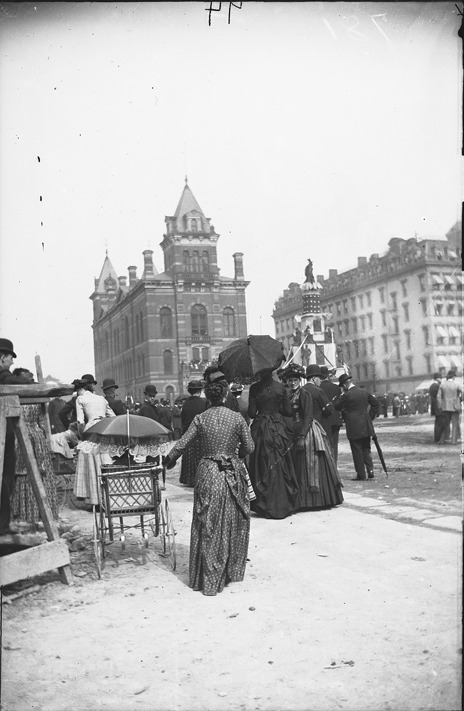 View of the Central Market with the Soldiers' and Sailors' monument in front, a group of women, one with baby buggy, gather in foreground. Recorded in glass negative ledger: "LD/Markets-Central."