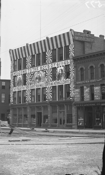 Favorite this☆ Dean, Godfrey & Co. on Griswold Description: View of Dean, Godfrey & Co. on Griswold, decorated for a G.A.R National Encampment with Grindley's Real Estate Exchange next door and a view of the street. Recorded in glass negative ledger: "LD/Industries & bus. houses-Dean, Godfrey & Co." Details Resource ID: EB02e032 Subject: House painters--Michigan--Detroit Interior decoration firms--Michigan--Detroit Real estate business--Michigan--Detroit Grand Army of the Republic-- Anniversaries, etc. Glass negatives Date Issued: 1891 Format: 1 negative : glass ; 5 x 3 in. Member of: Burton Historical Collection Negative Number: BHC glass neg. no. 1060 Rights: Physical rights are retained by DPL. Copyright is retained in accordance with U.S. copyright laws.