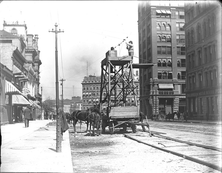 Favorite this☆ Workmen installing utility wire on Fort Street Description: View of two workmen standing atop a wooden tower on a wagon installing utility wire. Two horses stand nearby. Businesses in background. Recorded in glass negative ledger: "D/Streets-Fort." Details Resource ID: EB02e066 Subject: Skilled labor--Michigan--Detroit Telecommunication wiring--Michigan--Detroit Streets--Michigan--Detroit Towers--Michigan--Detroit Glass negatives Date Issued: Unknown year Format: 1 negative : glass ; 4 x 5 in. Member of: Burton Historical Collection Negative Number: BHC glass neg. no. 1531 Rights: Physical rights are retained by DPL. Copyright is retained in accordance with U.S. copyright laws.