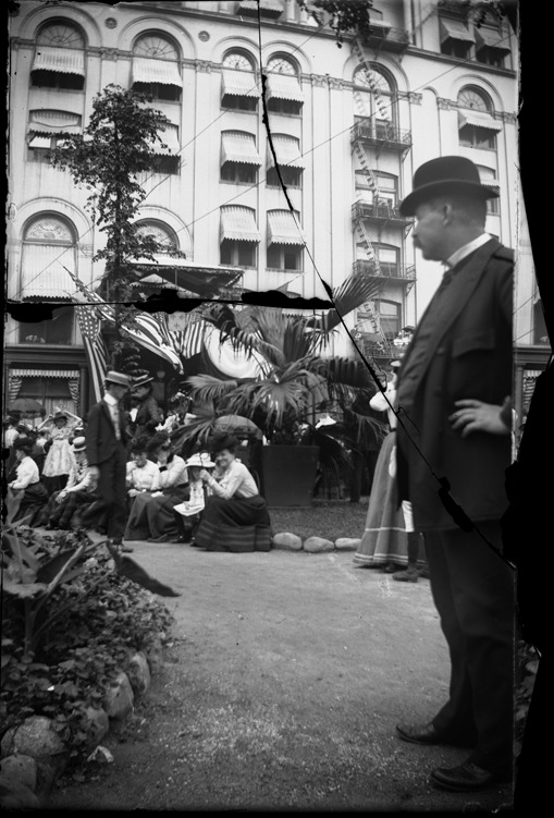People gathered in front of the Hotel Cadillac on Michigan Avenue. Recorded in glass negative ledger: "D/Hotels-Cadillac." Glass negative is broken.