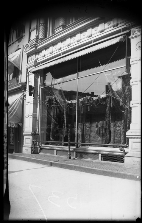 View of a window decorated with oriental rugs in the Majestic Building on the northwest corner of Woodward and Michigan avenues. Recorded in glass negative ledger: "D/Buildings-Majestic."
