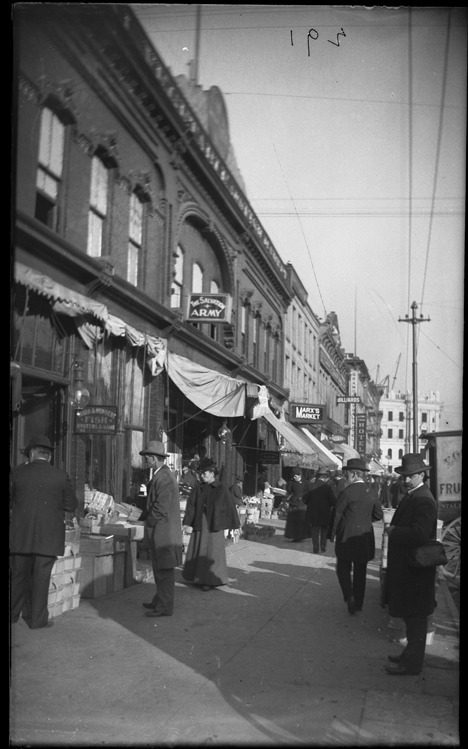 Favorite this☆ Businesses at Cadillac Square Description: Businesses at Cadillac Square including Marx's Market, Grand Central Hotel and the Salvation Army, with people on the sidewalk. Recorded in glass negative ledger: "D/Streets-Cadillac Square." Details Resource ID: EB02e075 Subject: Grocery trade--Michigan--Detroit Hotels--Michigan--Detroit Salvation Army--Michigan--Detroit Glass negatives Date Issued: Unknown year Format: 1 negative : glass ; 5 x 3.25 in. Member of: Burton Historical Collection Negative Number: BHC glass neg. no. 1540 Rights: Physical rights are retained by DPL. Copyright is retained in accordance with U.S. copyright laws.