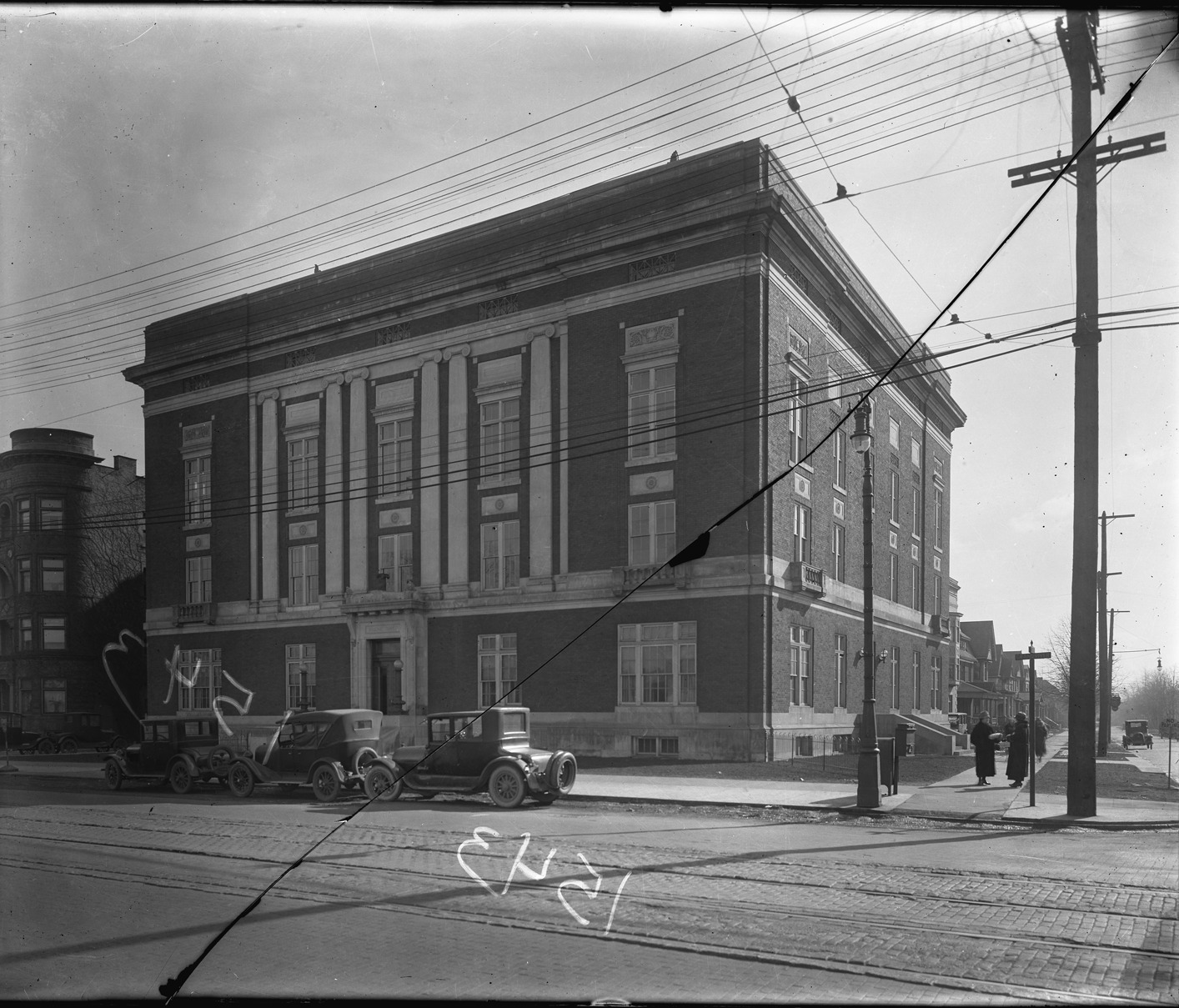 Front and one side of the Masonic Temple on Grand River, with cars parked in street in front. Recorded in glass negative ledger: "D/Organizations (Ionic)-Masonic Temple." Glass negative is cracked.
