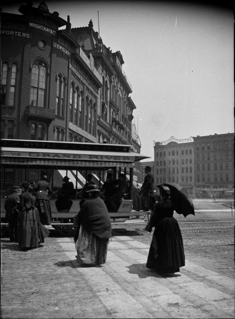 Women board the Grand River streetcar at Campus Martius, Wright, Kay & Co. and Gies's European Hotel in background. Recorded in glass negative ledger: "LD/Streets-Campus Martius."