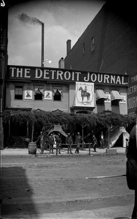 Uniformed men stand in front of the Detroit Journal building, with a woman selling lemonade behind them, poster of Civil War era men including William Tecumseh Sherman and U.S. Grant , as well as a poster of a man on horseback with, "Burnie & Bob," printed on it, hang near top of building. Recorded in glass negative ledger: "D/Newspapers-Detroit Journal."