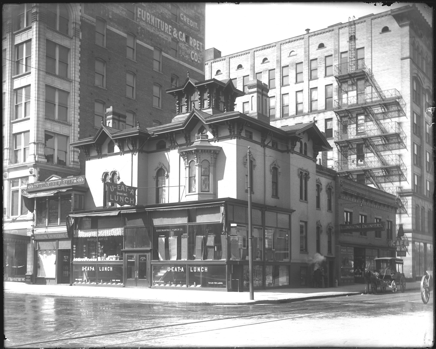 Corner of Washington Street and State Street showing businesses of Russell Art Co., Rheaume Bros. U-Eat-A Lunch, Addeman Wall Paper Co., around the corner a sign for Illuminating Engineers, a cafe and horse-drawn carriage. Recorded in glass negative ledger: "D/Streets-Washington & State."