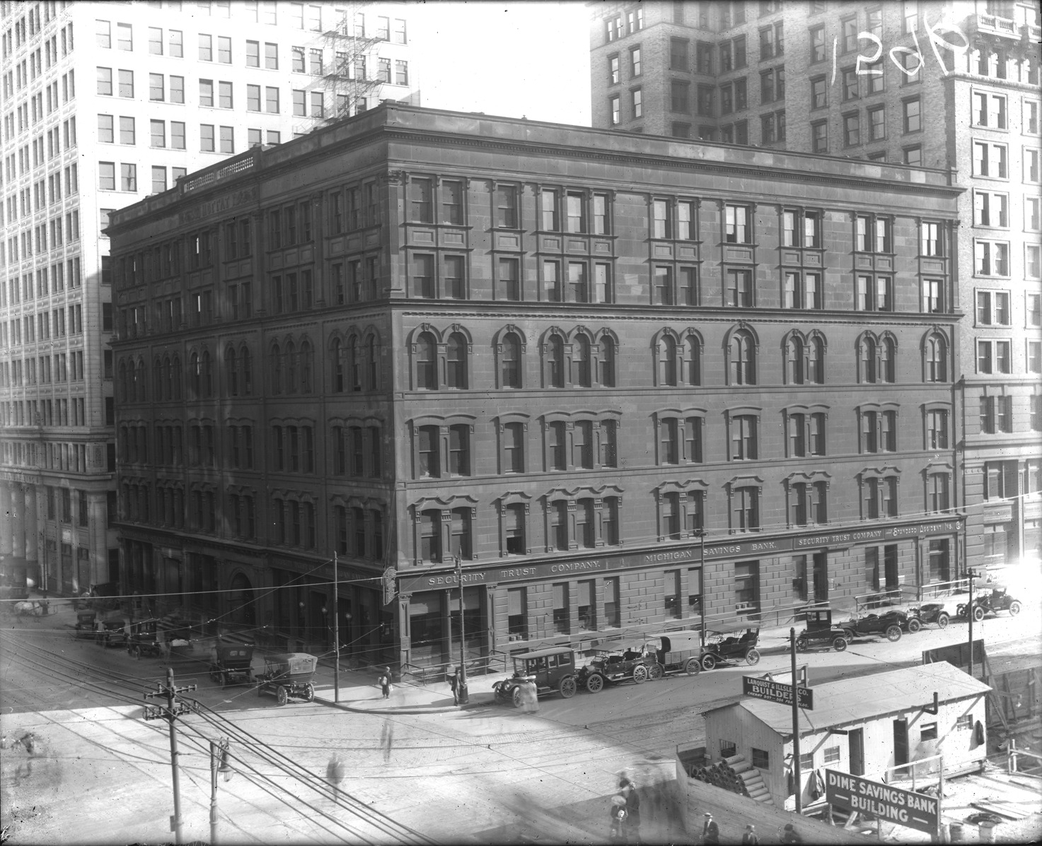 View of Moffat Building on Griswold containing offices of Michigan Savings Bank and Security Trust Co. Across the street, Lanquist & Illsle Co. Builders sign on construction site for Dime Savings Bank Building; a variety of cars on street. Recorded in glass negative ledger: "D/Buildings-Moffat, west side south from Clifford."