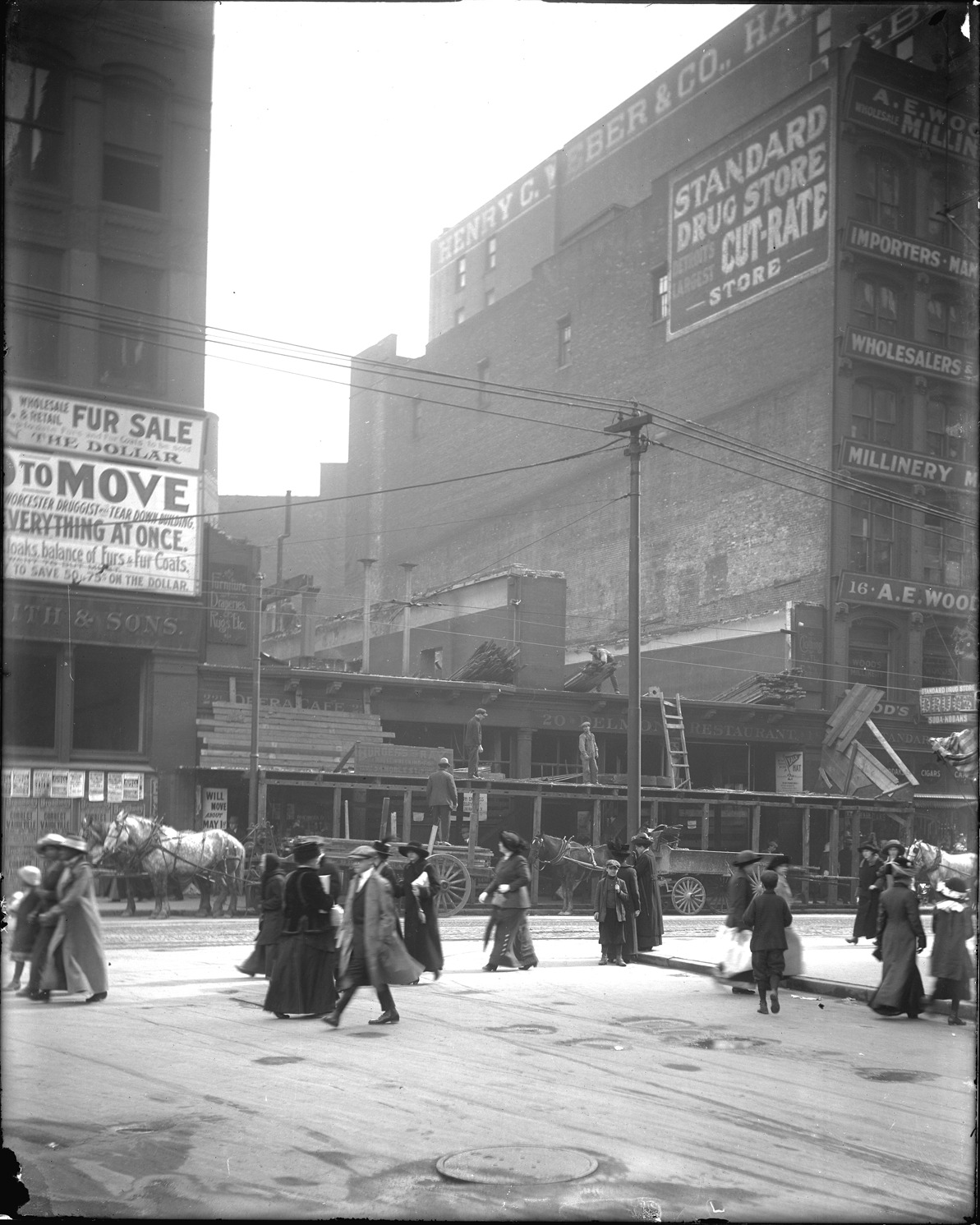 People walking between Gratiot Avenue and Farmer Street and in the background Burgess and Ray Housewecking Co., Standard Drug Store, group of men getting plywood from roof of a building, horse-drawn wagons and Henry C. Weber and Co. Recorded in glass negative ledger: "LD/Streets-Gratiot & Farmer."