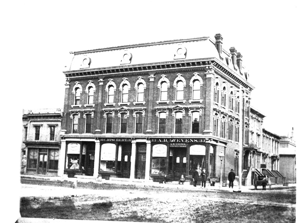 Second Empire building viewed diagonally across intersection. Cranage Building contains businesses of A.B. Lyons, analytical chemist; A.B. Stevens, druggist; and C. Rischert, confectioner, on Lafayette; children sitting on step and several men in front on corner. Also have print from negative. Handwritten on back of albumen cabinet card: "Thos. Cranage Building, cor. Shelby & Lafayette. Mr. Cranage is the central figure. Between 1880 and 1890. 33 Lafayette Ave." Recorded in glass negative ledger: "D/Buildings-Cranage." Cabinet card marked with red liquid.