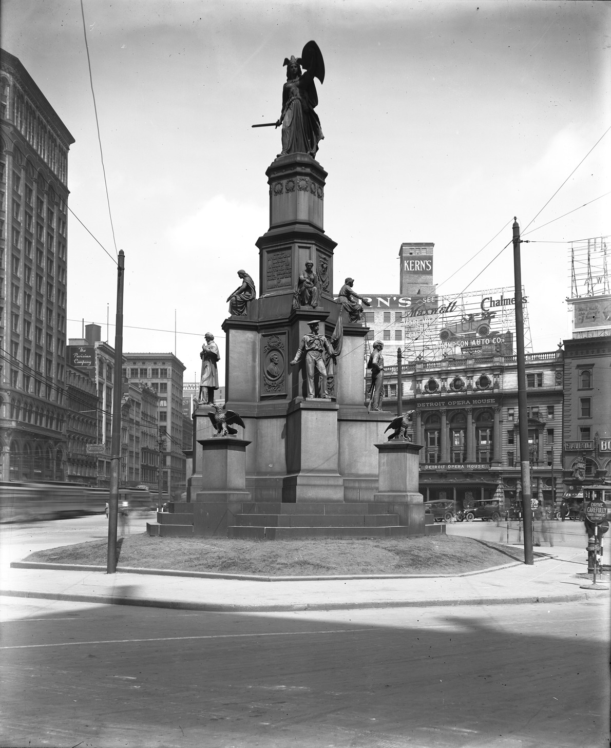 View of Soldiers' and Sailors' Monument looking north, in the background Kerns department store, the Detroit Opera House, and a sidewalk sign reading "Drive Carefully Turn Corners Slowly." Large, electric sign for Maxwell Chalmers car at Thompson Auto Co., with picture of car, is above opera house. Recorded in glass negative ledger: "D/Monuments-Soldiers' & sailors."
