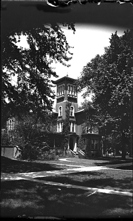 View of the residence of John J. Bagley on Washington Blvd. and Park Ave., in Detroit, Michigan. The home is an example of an Italian villa, built in 1869, for the first time in Michigan, plate glass was used in the windows of the residence. Recorded in glass negative ledger: "D/Historic houses-Bagley, Gov. John."