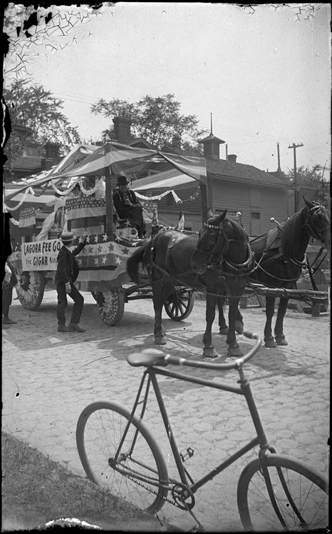 Team of horses pulls a parade float for Lagora Fee Co. in Detroit's bicentennial celebration, with bicycle against curb in foreground. Recorded in glass negative ledger: "D/Anniversaries-Bicentenary celebration."
