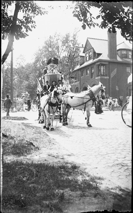 Favorite this☆ Parade float for Detroit's bicentennial celebration Description: Two horses pull a float participating in Detroit's bicentennial celebration on cobblestone street. Recorded in glass negative ledger: "D/Anniversaries-Bicentenary celebration." Details Resource ID: EB02e180 Subject: Parades--Michigan--Detroit Detroit (Mich.)--Centennial celebrations, etc. Parade floats--Michigan--Detroit Horse-drawn vehicles--Michigan--Detroit Glass negatives Date Issued: 1901 Format: 1 negative : glass ; 5 x 3 in. Member of: Burton Historical Collection Negative Number: BHC glass neg. no. 2489 Rights: Physical rights are retained by DPL. Copyright is retained in accordance with U.S. copyright laws.