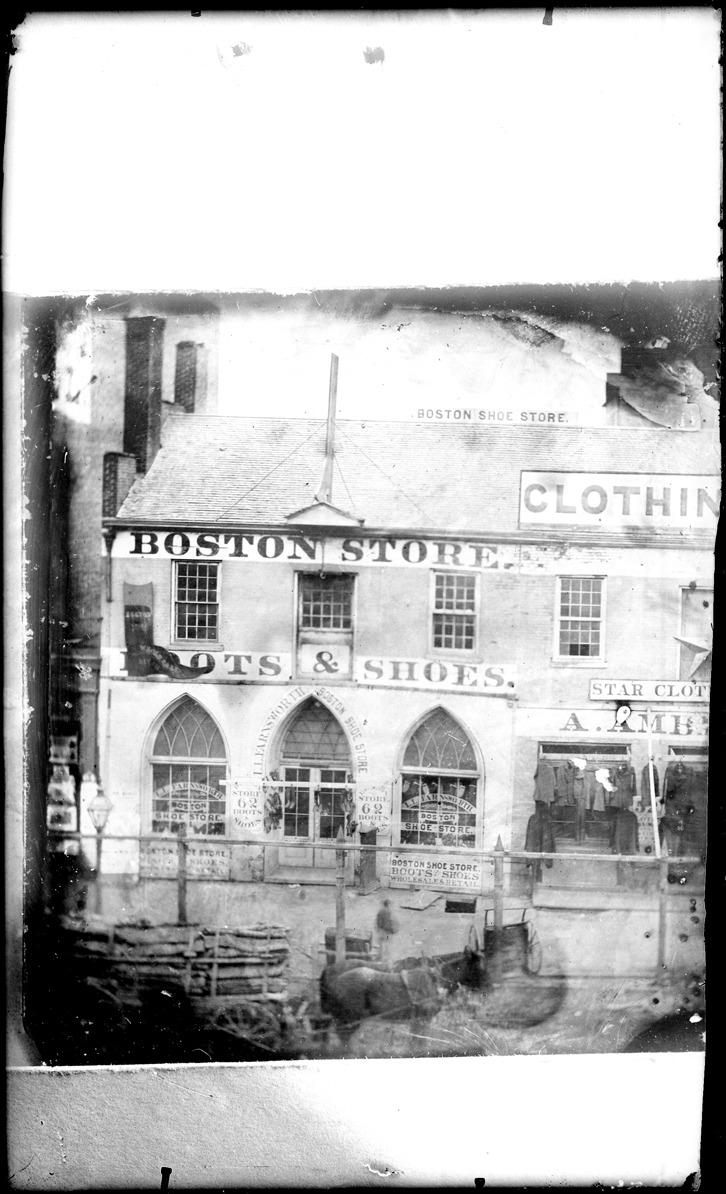 Favorite this☆ L.L. Farnsworth Boston shoe store Description: L.L. Farnsworth Boston shoe store on the corner of Woodward and Michigan avenues with a clothing store next door and horse-drawn vehicle in street. Recorded in glass negative ledger: "LD/Industries & business houses-Boston store." Details Resource ID: EB02e187 Subject: Shoe stores--Michigan--Detroit Commercial buildings--Michigan--Detroit Glass negatives Date Issued: Unknown year Format: 1 negative : glass ; 8 x 5 in. Member of: Burton Historical Collection Negative Number: BHC glass neg. no. 1667 Rights: Physical rights are retained by DPL. Copyright is retained in accordance with U.S. copyright laws.