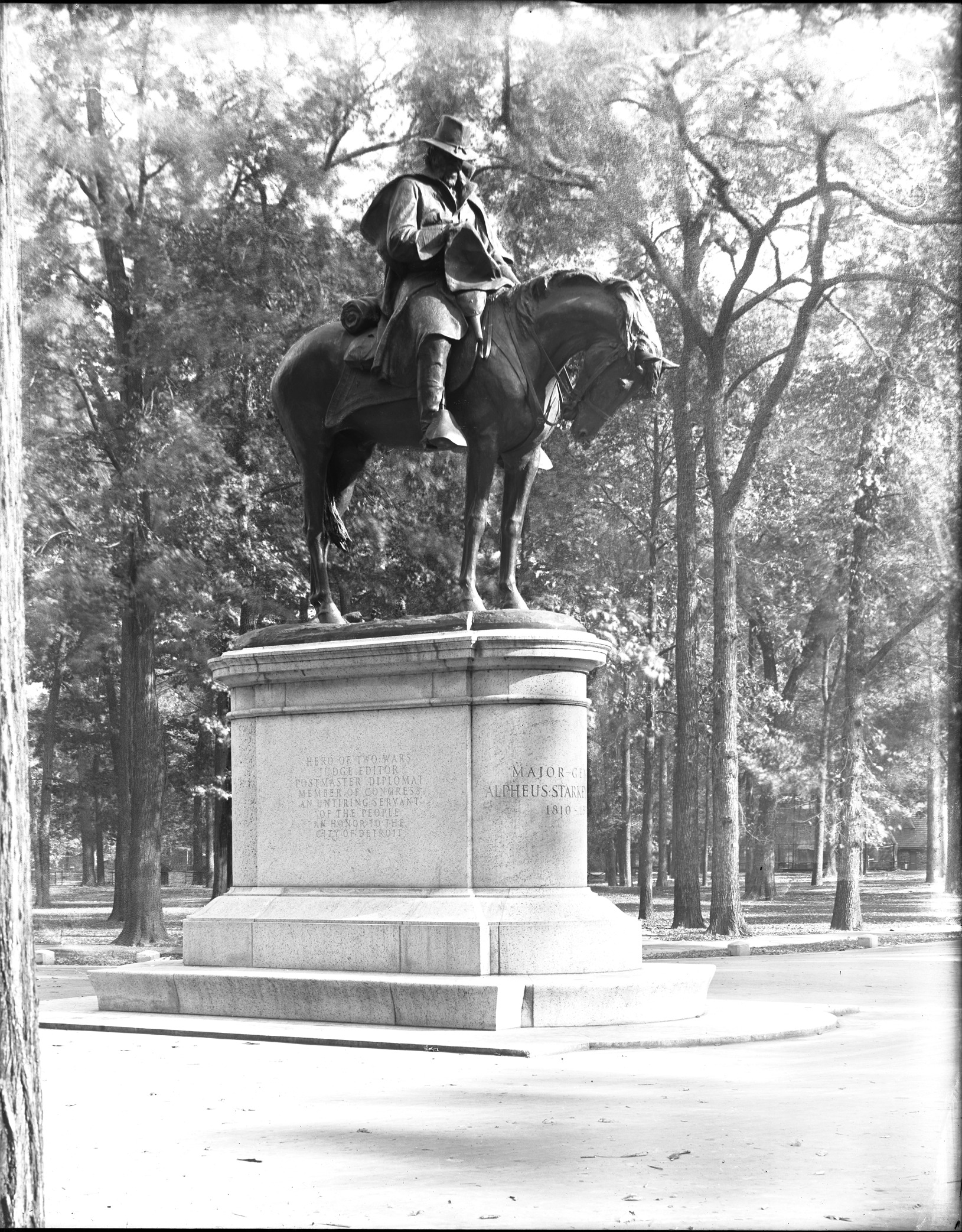 Statue of Major General Alpheus Starkey Williams, Detroit's earliest equestrian monument, designed by Henry Merwin Shrady in 1921. The monument stands at Central and Inselruhe Aves. on Belle Isle. Recorded in glass negative ledger: "LD/Monuments-Williams, Alpheus."