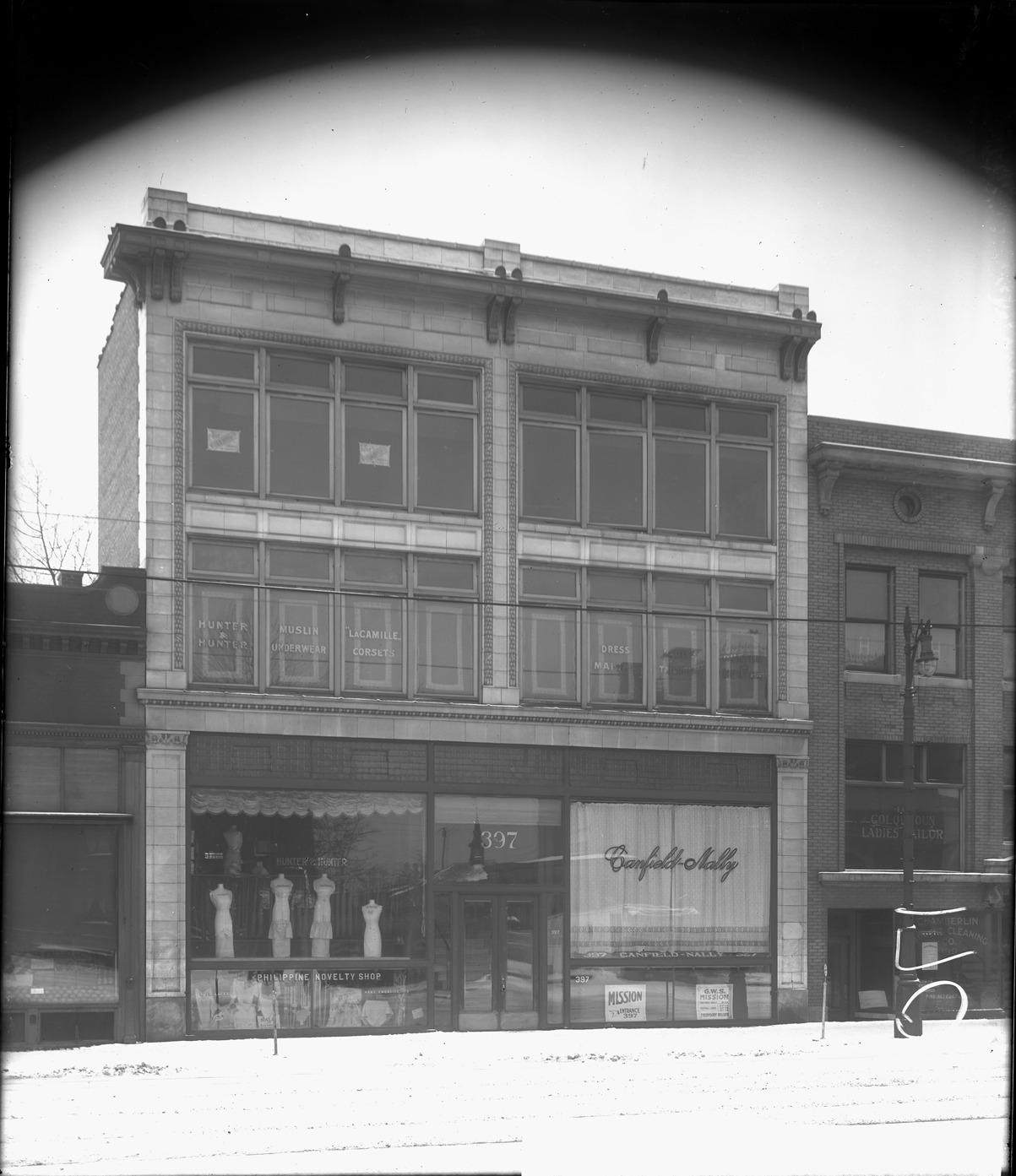 Garment-related shops along the snow-covered street of Woodward near Henry include ladies' tailors Hunter & Hunter, Chamberlain Garment Cleaning Co., and Canfield-Nally, milliners. Label pasted on lower right-hand corner of negative. Recorded in glass negative ledger: "D/Streets-Woodward (397 Woodward)."