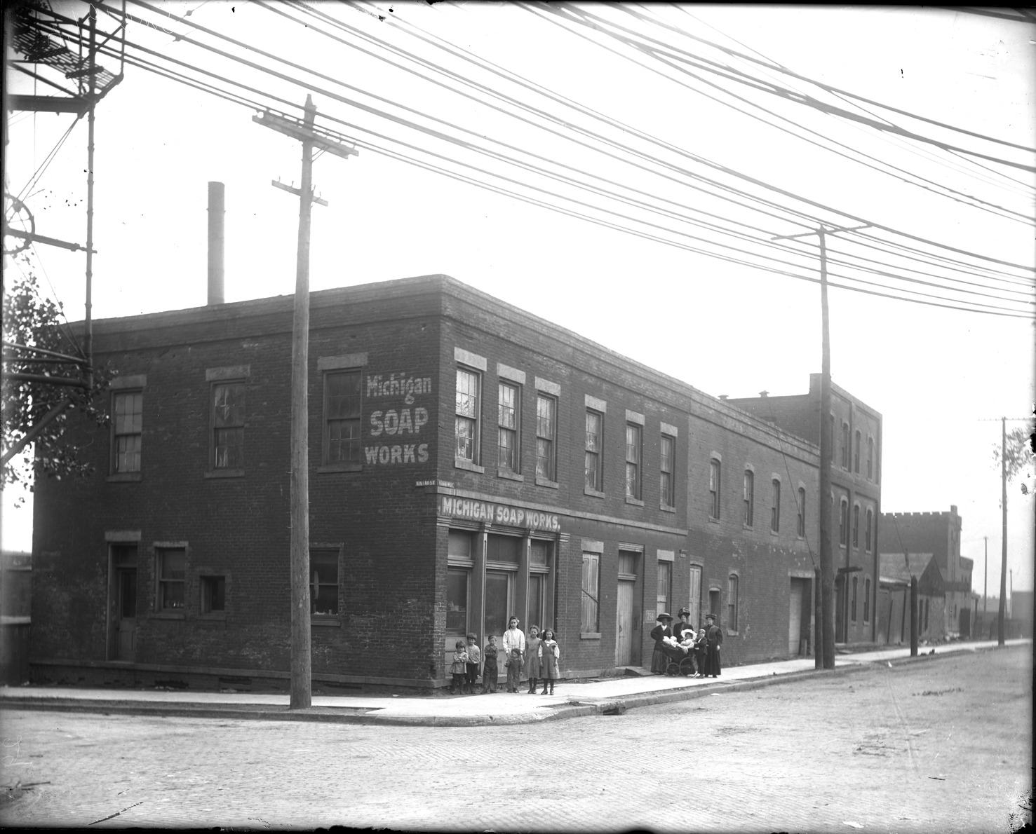 Corner of Rivard and Franklin streets, showing Michigan Soap Works, a group of children standing in front along near three women, a boy and a baby carriage with two babies. Recorded in glass negative ledger: "D/Streets-Rivard."